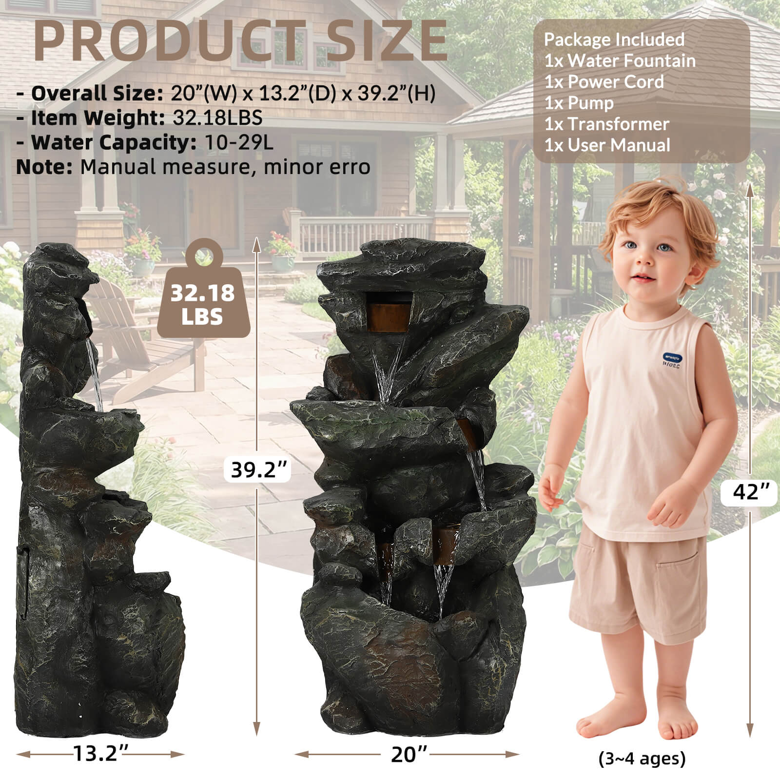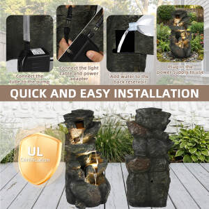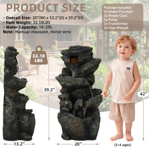 【Easy Installation & Service】Overall Dimensions: 20″ L x 13.2″ W x 39.2″ H, Water Capacity: 10-29L. Come with a UL-listed 110V-120V American plug for safe use,this outdoor fountain is easy to assemble, just connect the pump and light’s lines and then add water for use, no tools required. If you have any questions or need assistance, please do not hesitate to contact our customer service