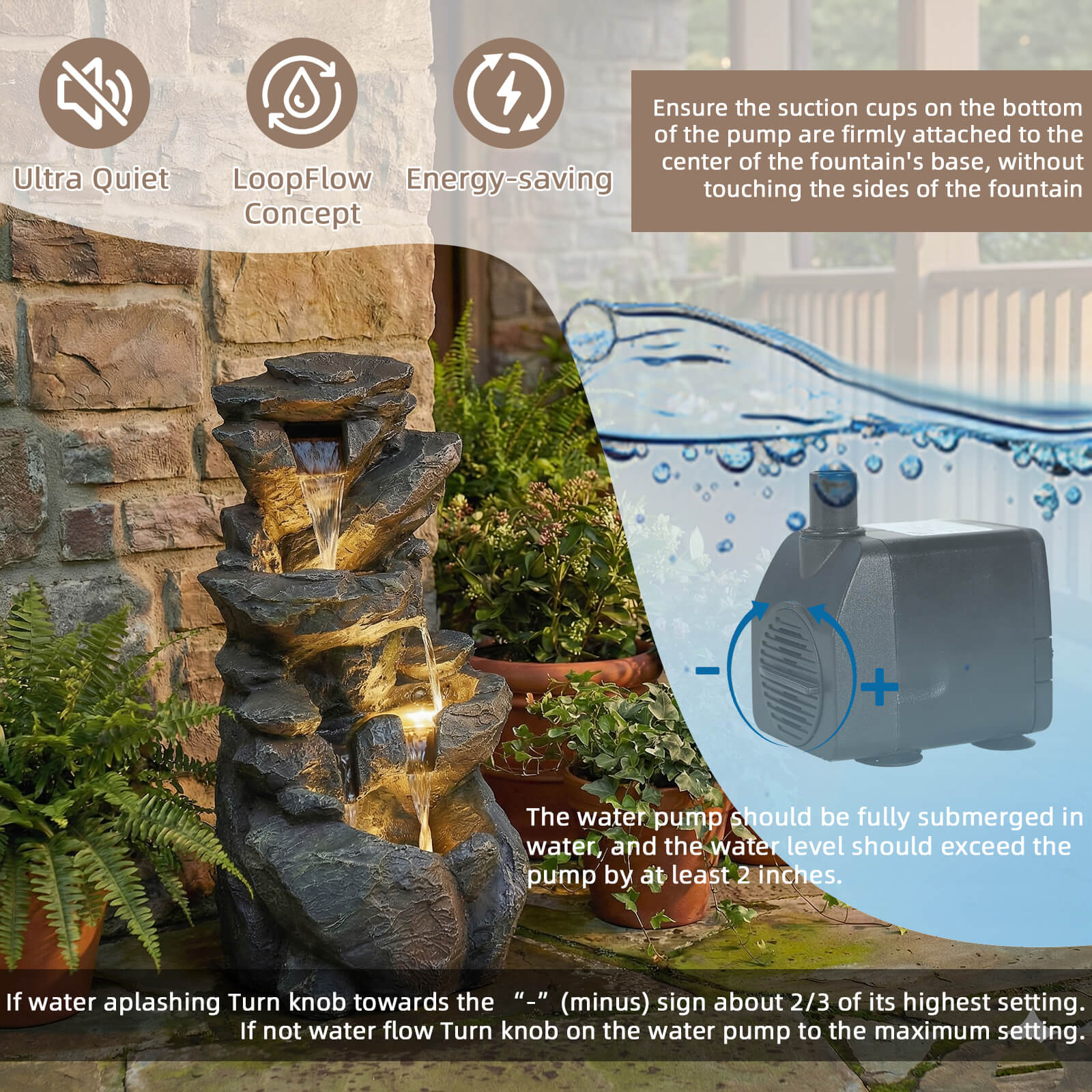 Adjustable Quiet Flow, Durable Resin (Heat/Wind/Rain Resistant), Realistic Rock Texture, Easy Install + UL-Certified Safe, Indoor/Outdoor Dual-Purpose, Warm LED Lights (Day & Night Use), DIY Fish Tank & Light Color Customizable