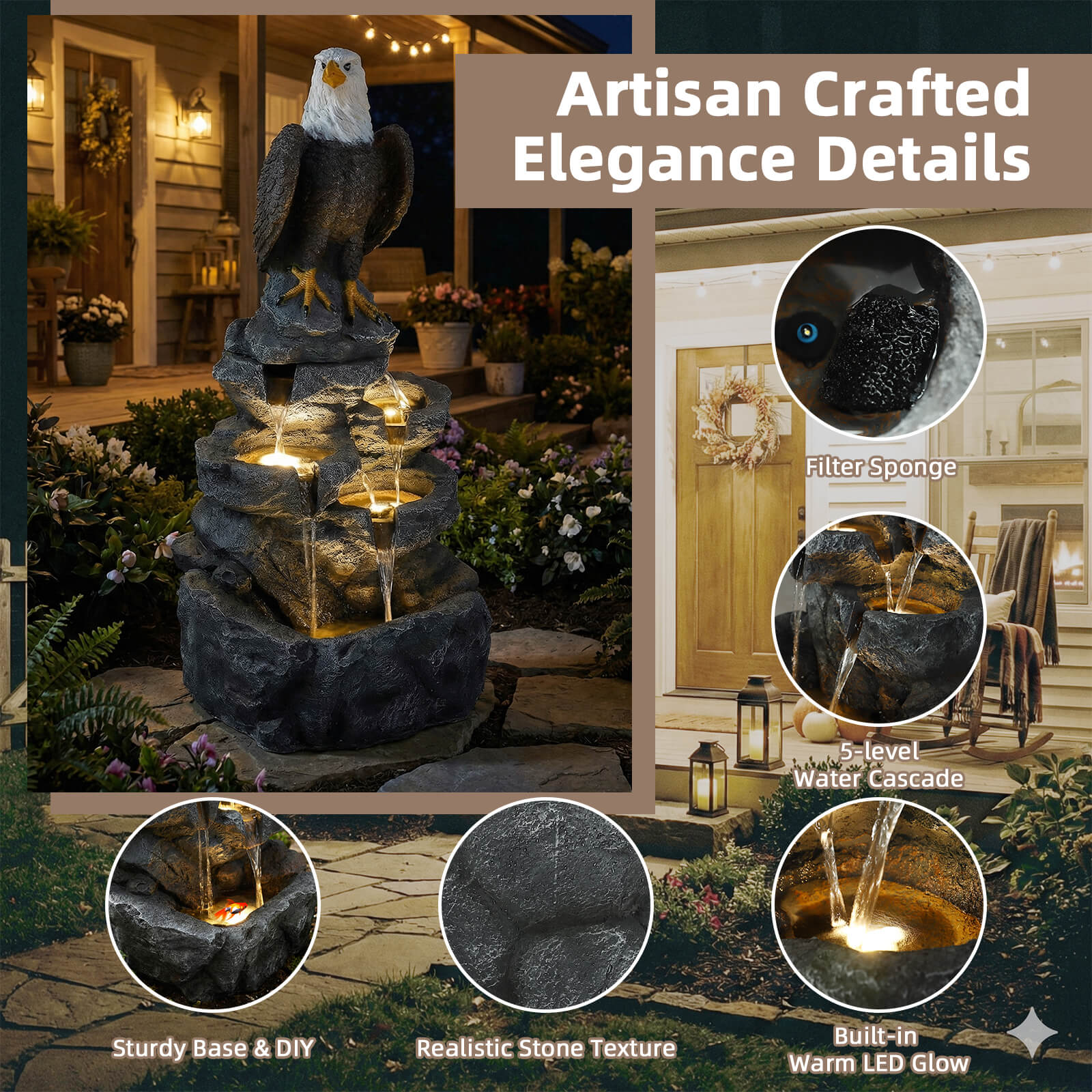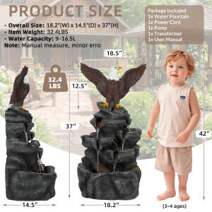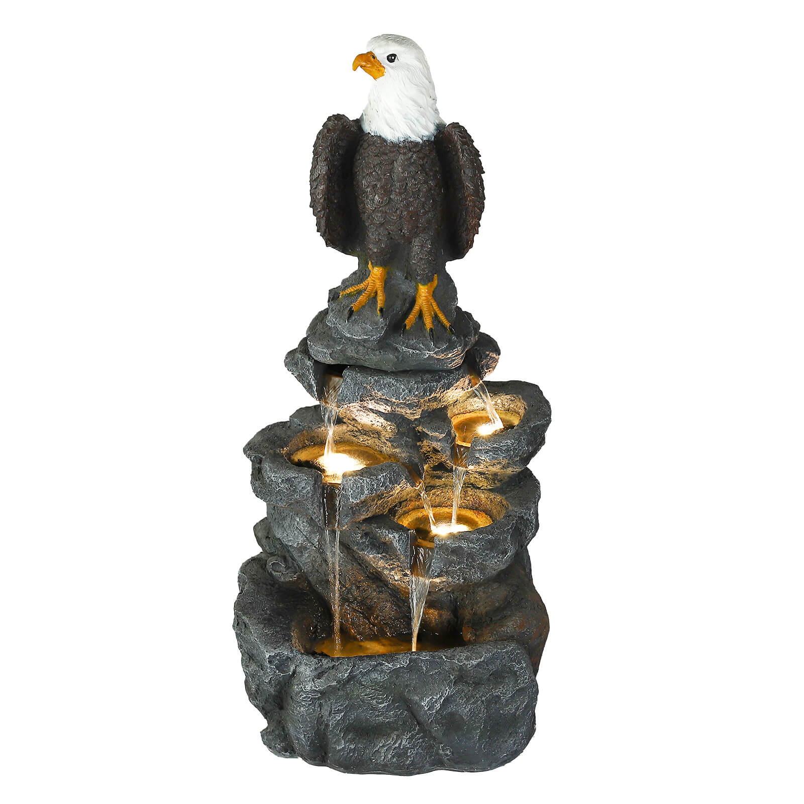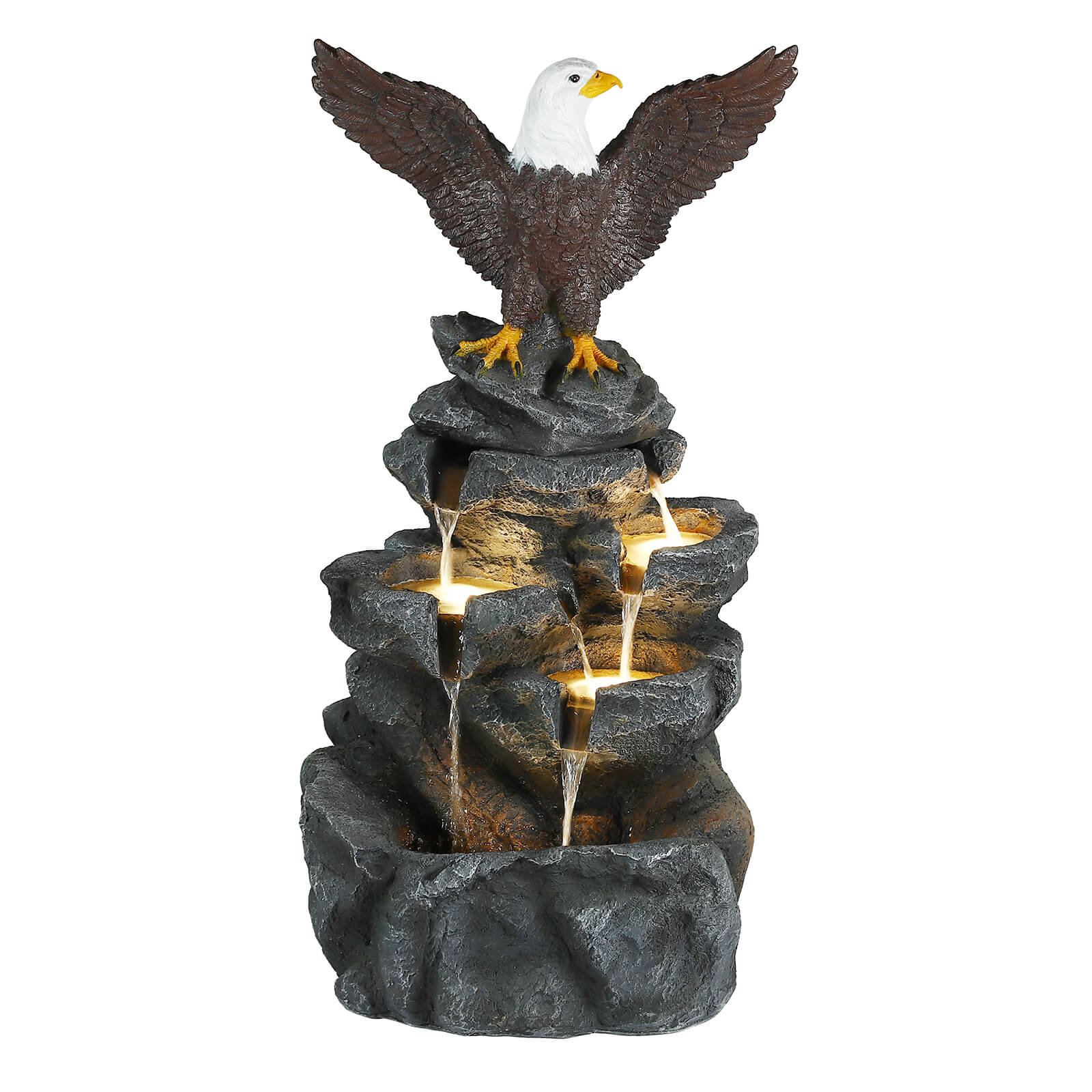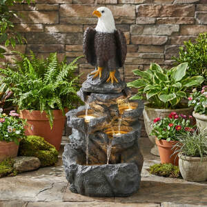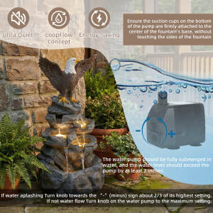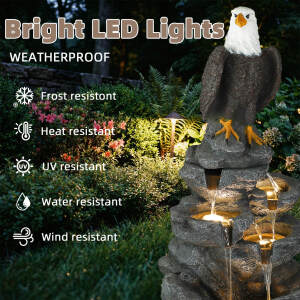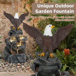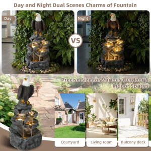 5-Tier Adjustable Quiet Flow, Realistic Bald Eagle Statue, Durable Resin (Heat/Wind/Rain Resistant), Realistic Rock Texture, Easy Install + UL-Certified Safe, Indoor/Outdoor Dual-Purpose, Warm LED Lights (Day & Night Use), DIY Fish Tank & Light Color Customizable