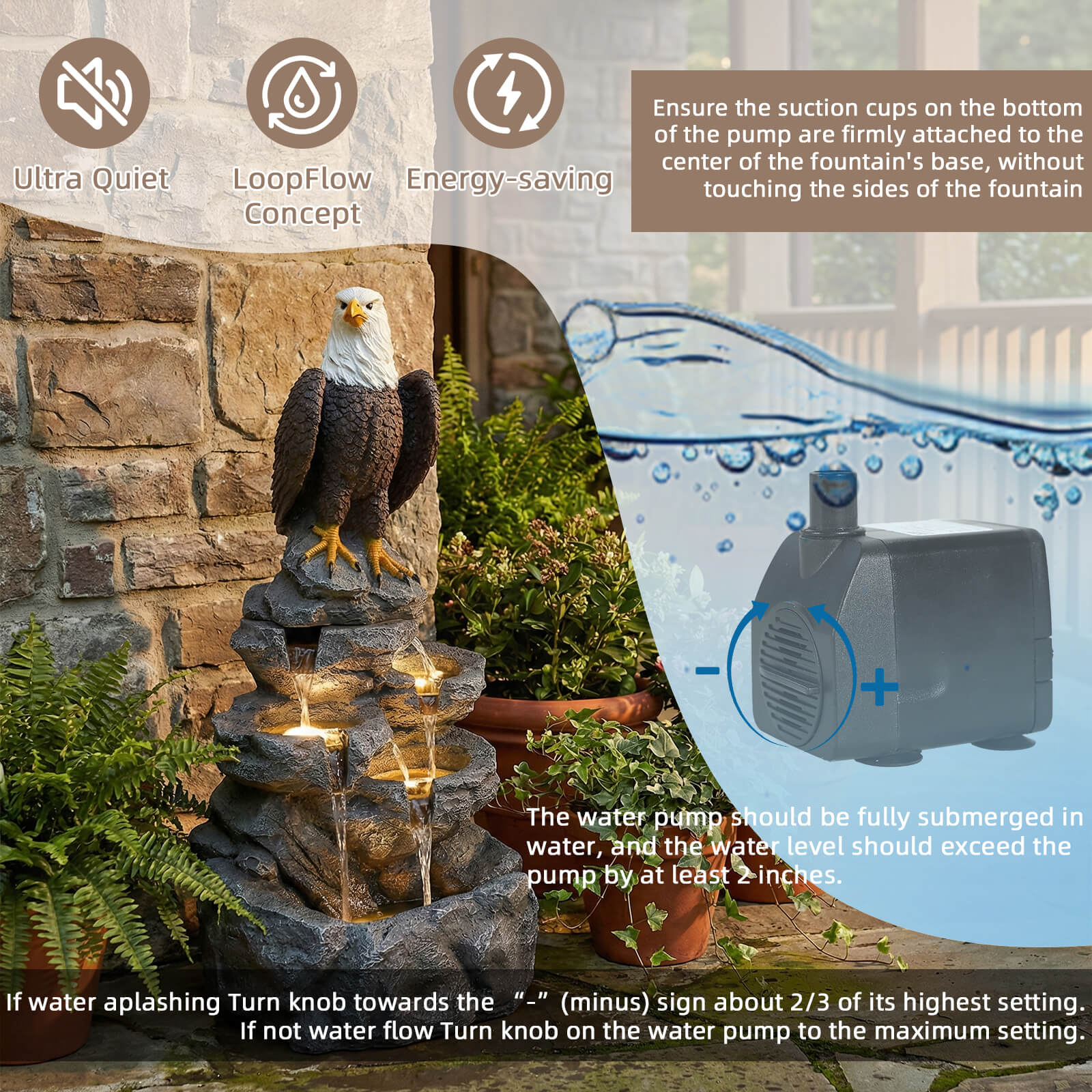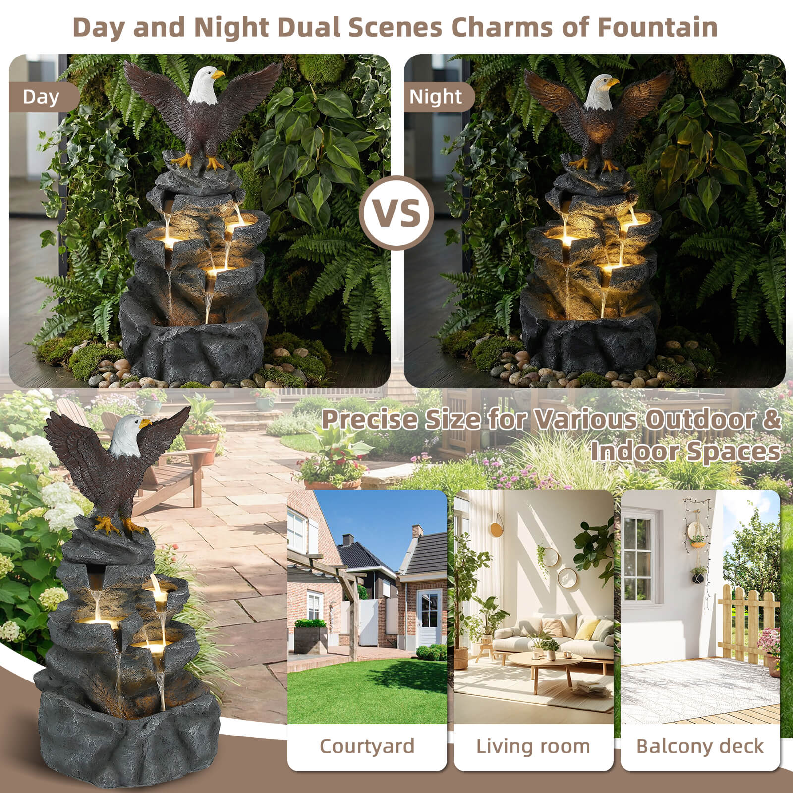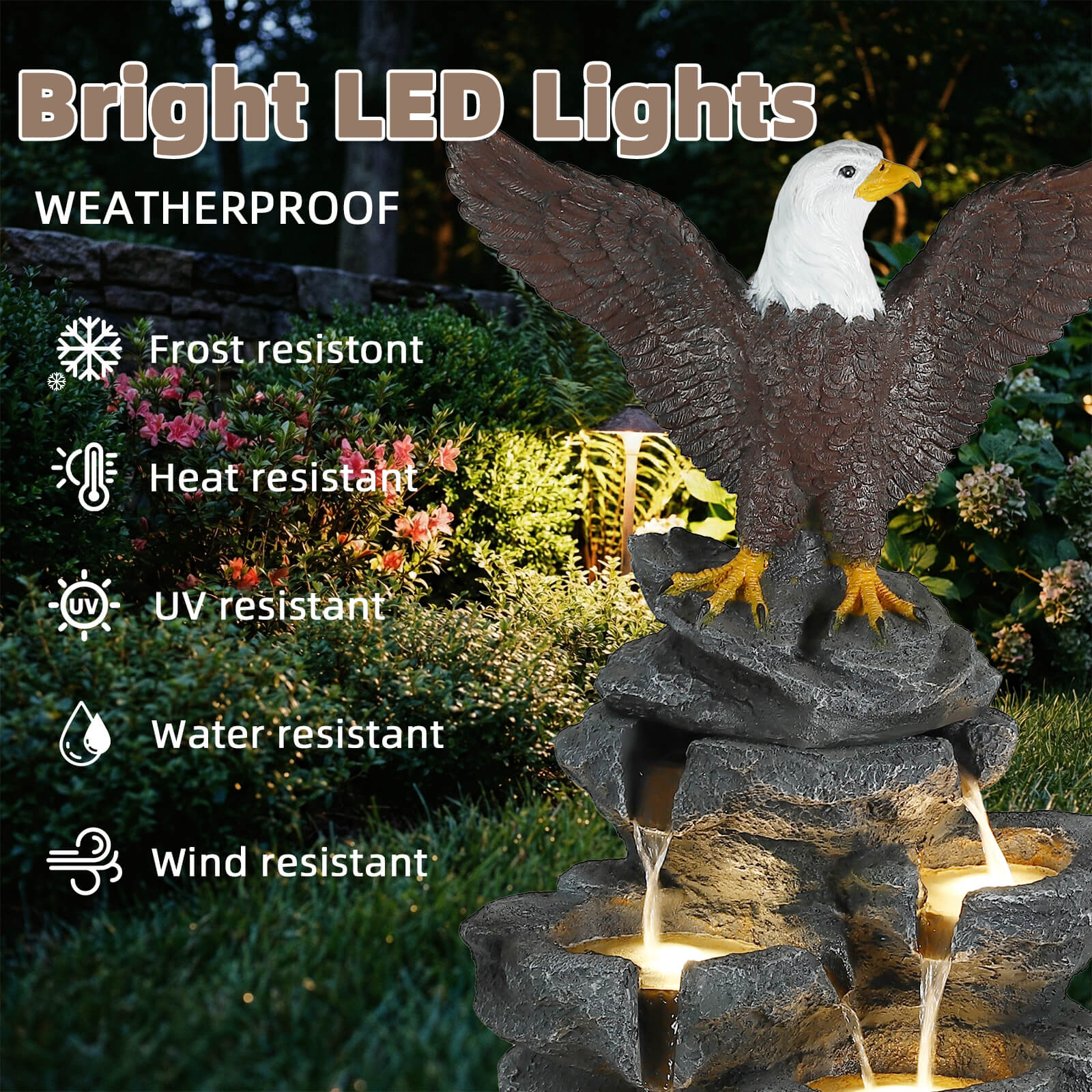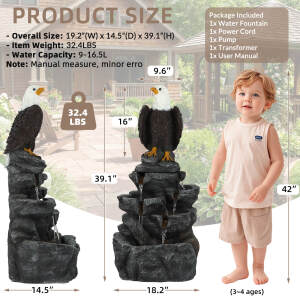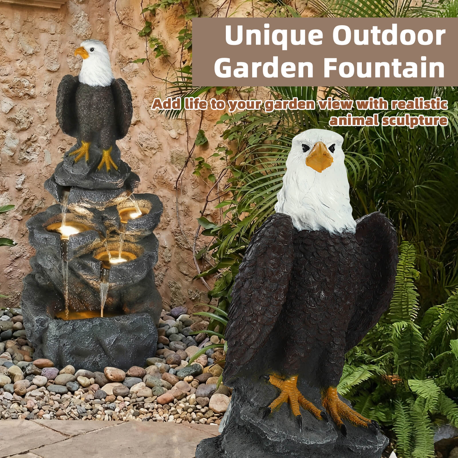 5-Tier Adjustable Quiet Flow, Realistic Bald Eagle Statue, Durable Resin (Heat/Wind/Rain Resistant), Realistic Rock Texture, Easy Install + UL-Certified Safe, Indoor/Outdoor Dual-Purpose, Warm LED Lights (Day & Night Use), DIY Fish Tank & Light Color Customizable