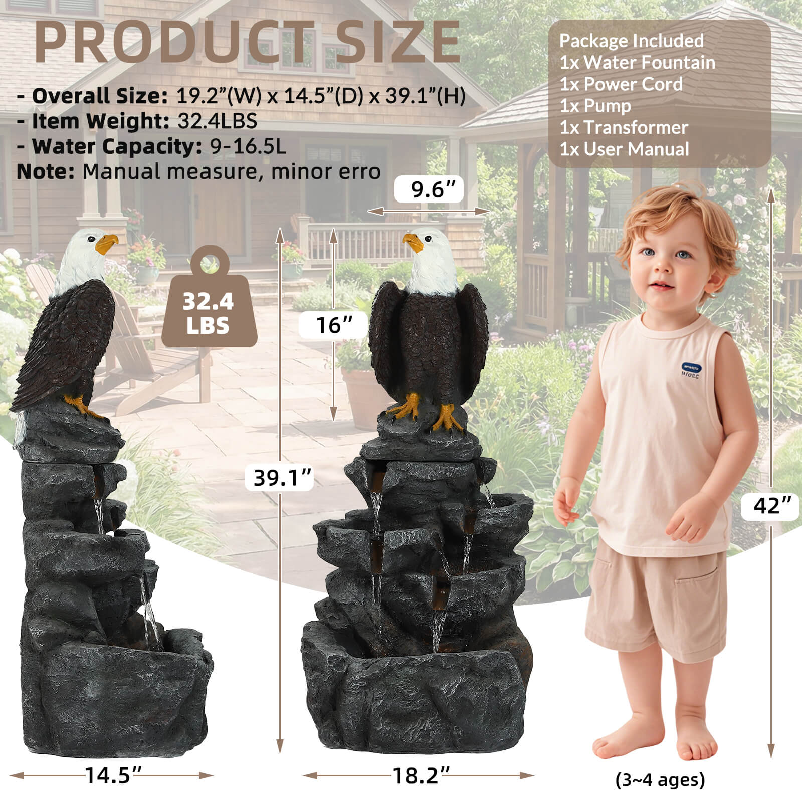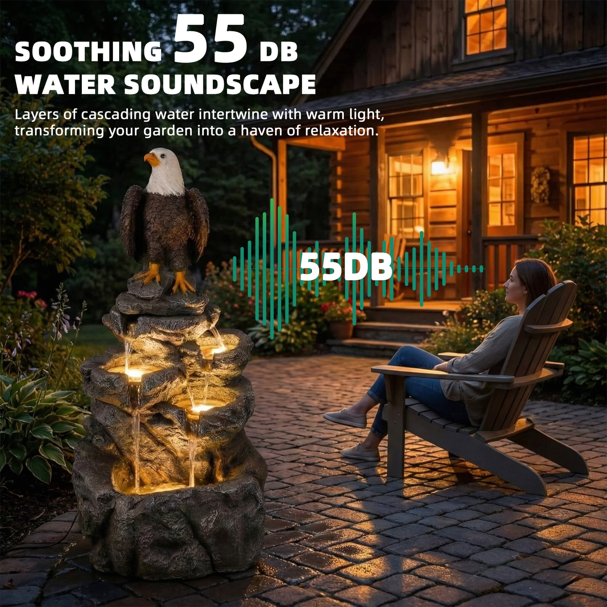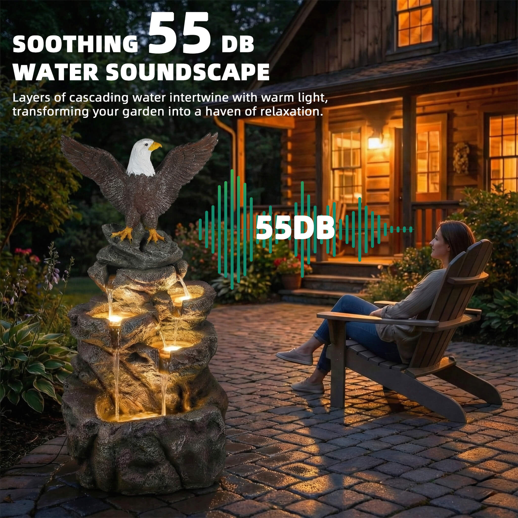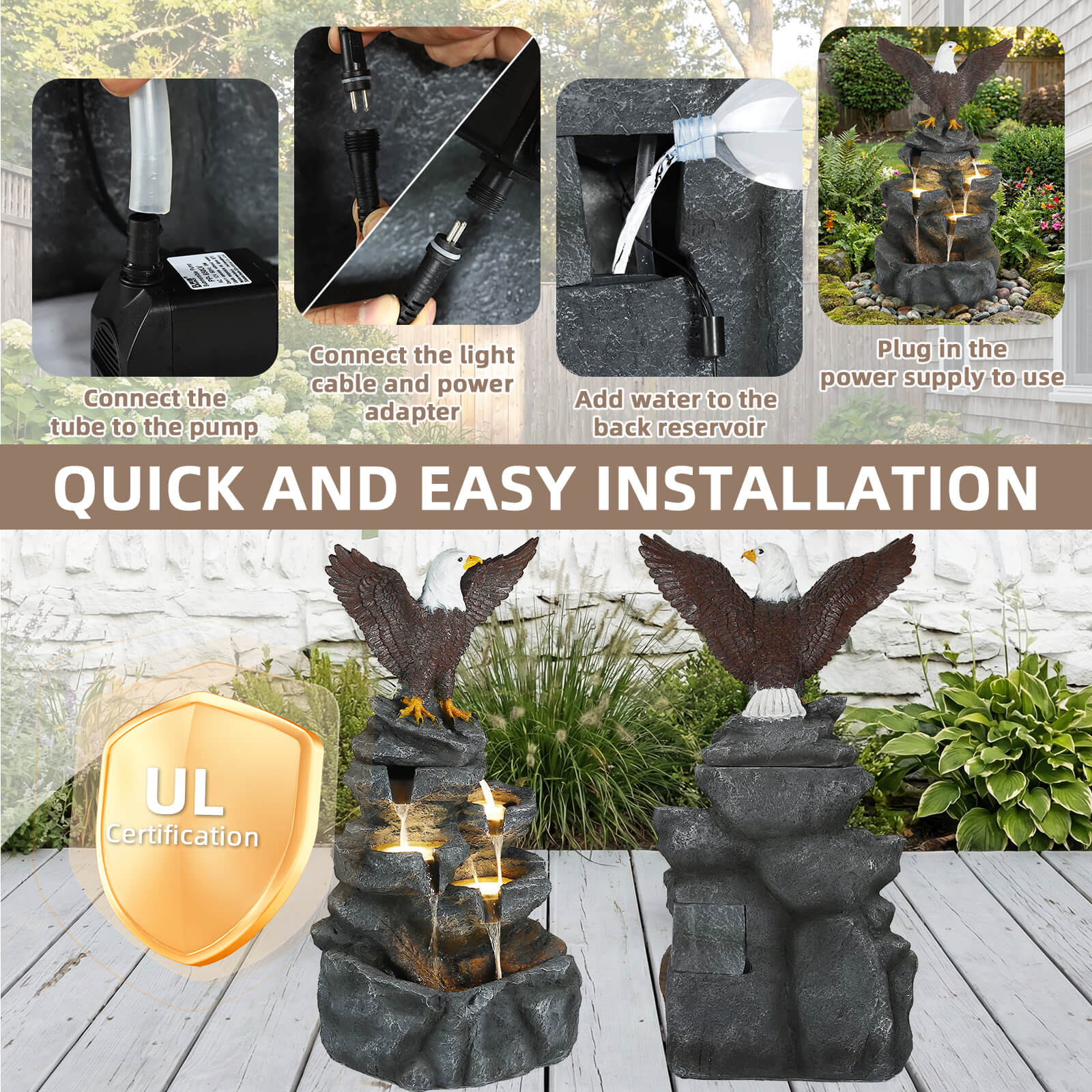 5-Tier Adjustable Quiet Flow, Realistic Bald Eagle Statue, Durable Resin (Heat/Wind/Rain Resistant), Realistic Rock Texture, Easy Install + UL-Certified Safe, Indoor/Outdoor Dual-Purpose, Warm LED Lights (Day & Night Use), DIY Fish Tank & Light Color Customizable
