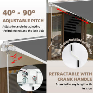 【Adjustable Slope & Retractable】Equipped with an easy-to-operate manual crank, you can effortlessly adjust the shade area to create the perfect amount of shade without letting the harsh sunlight ruin your outdoor leisure time. In addition, you can also adjust the angle of the patio awning by adjusting the locking screw, providing better shading according to varying sunlight exposure. (Angle adjustment range: 40°-90°)