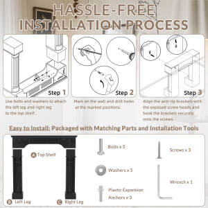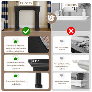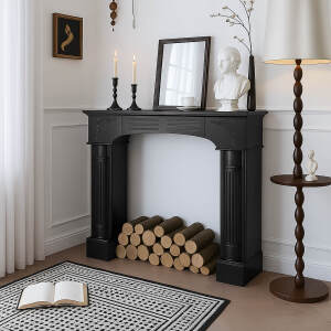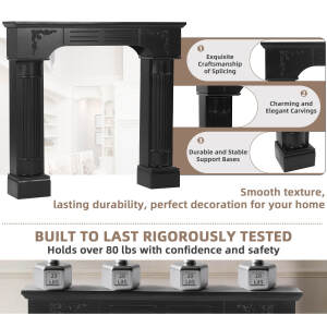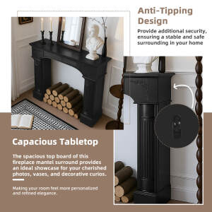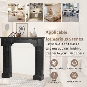 Functional Features for Everyday Living: This freestanding fireplace mantel is finished with superior black paint that effectively resists cracking, and its excellent heat resistance protects the countertop from damage or discoloration caused by the hot heat emitted by the fireplace. The surface is smooth, waterproof and dust-proof, making daily cleaning convenient: Just use a damp cloth to wipe away stains, allowing you to easily maintain a clean home and enjoy a comfortable living experience