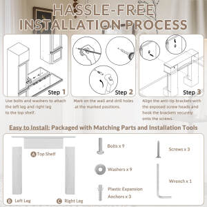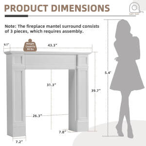 Assemble & Customer Service: Overall Dimension: 43.3″D x 9.1″W x 39.7″H. The fireplace mantel surround can be assembled in 10-15 mins with the instruction included, no tools required. Note: 1. This is for electric fireplaces only, not gas; 2. The metal screw should be reserved and exposed a small part for latch, do not drive the screw all the way in; 3. If you have any questions or need assistance, please do not hesitate to contact our customer service