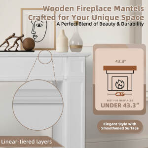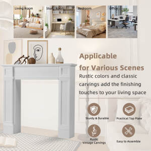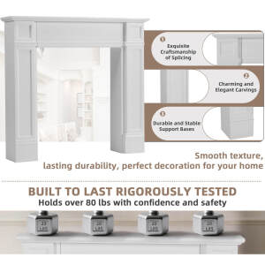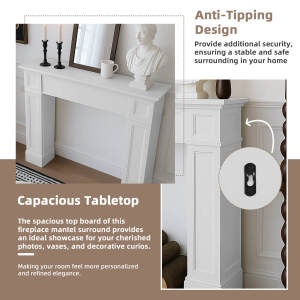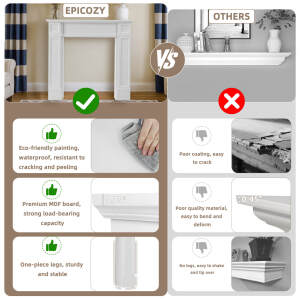 Functional Features for Everyday Living: This freestanding fireplace mantel is finished with superior white paint that effectively resists cracking, and its excellent heat resistance protects the countertop from damage or discoloration caused by the hot heat emitted by the fireplace. The surface is smooth, waterproof and dust-proof, making daily cleaning convenient: Just use a damp cloth to wipe away stains, allowing you to easily maintain a clean home and enjoy a comfortable living experience