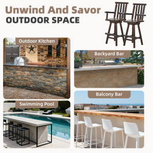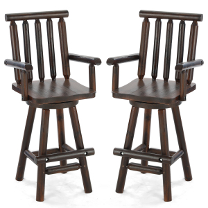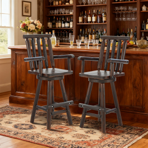 【360° Swivel Function & Built-in Footrest】Equipped with a heavy-duty 360° swivel mechanism secured by a lubricated steel pivot core, this Adirondack wooden bar stools set delivers ultra-smooth, silent rotation. You can easily swivel to reach for drinks on the counter or chat with guests without standing or moving the chairs. The sturdy log crossbars connecting the legs double as a comfortable footrest, reducing knee pressure and fatigue