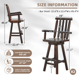 【Easy Setup & Notes】Dimensions: 22.4″D x 22.6″W x 49.4″H; Seat Height: 29.8″; Weight Capacity: 500 LBS. Perfect matches 41″-43″ bar height tables. Includes detailed instructions and hardware for quick setup. Notes: 1. Crafted from natural solid fir, features like tree knots and slight grain checks are inherent characteristics that enhance its rustic charm, not defects. 2. If you experience installation problems or any other issues, please feel free to contact our customer services