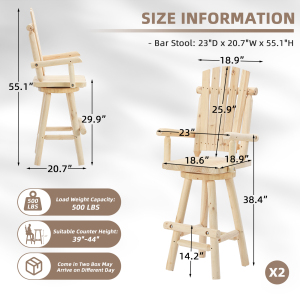 【Easy Setup & Notes】Dimensions: 20.7″D x 23″W x 55.1″H; Seat Height: 29.9″; Weight Capacity: 500 LBS. Perfect matches 41″-43″ bar height tables. Includes detailed instructions and hardware for quick setup. Notes: 1. Crafted from natural solid fir, features like tree knots and slight grain checks are inherent characteristics that enhance its rustic charm, not defects. 2. If you experience installation problems or any other issues, please feel free to contact our customer services