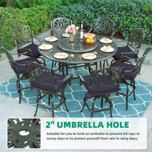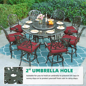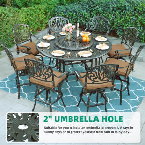【Practical Design 】The dining table features a centrally located 2-inch umbrella hole, making it simple to add a parasol for shade on sunny days and enhancing outdoor dining comfort. The table and chair legs have adjustable pads that provide stability even on uneven surfaces and stop any swaying