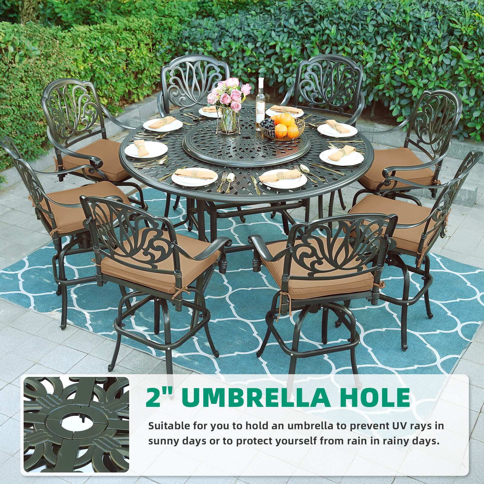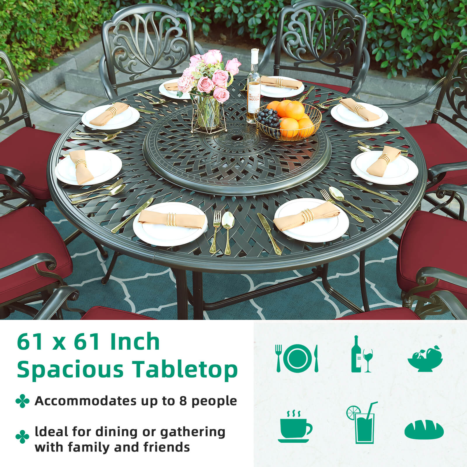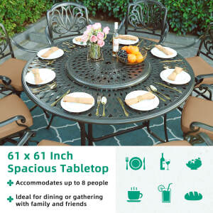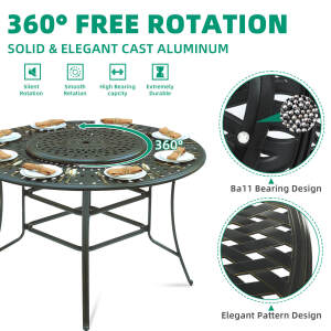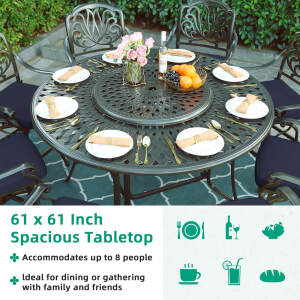 【Large Bar Dining Table】This spacious 61″ round bar dining table comfortably seats 4-8 people, making it perfect for large family gatherings and social events. The tabletop features a removable 31″ lazy susan turntable for easy food sharing from the centre. The ample surrounding space ensures everyone has plenty of room for their plates. This cast aluminum lazy susan will transform your dining experience and become a centerpiece for your hospitality and style