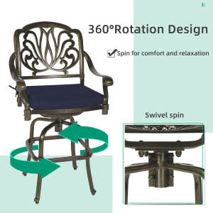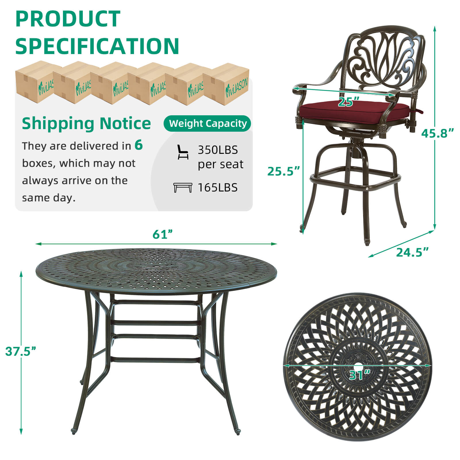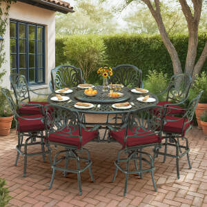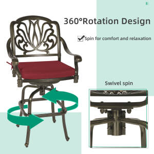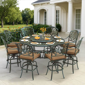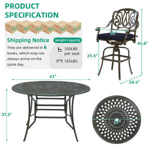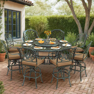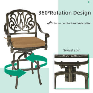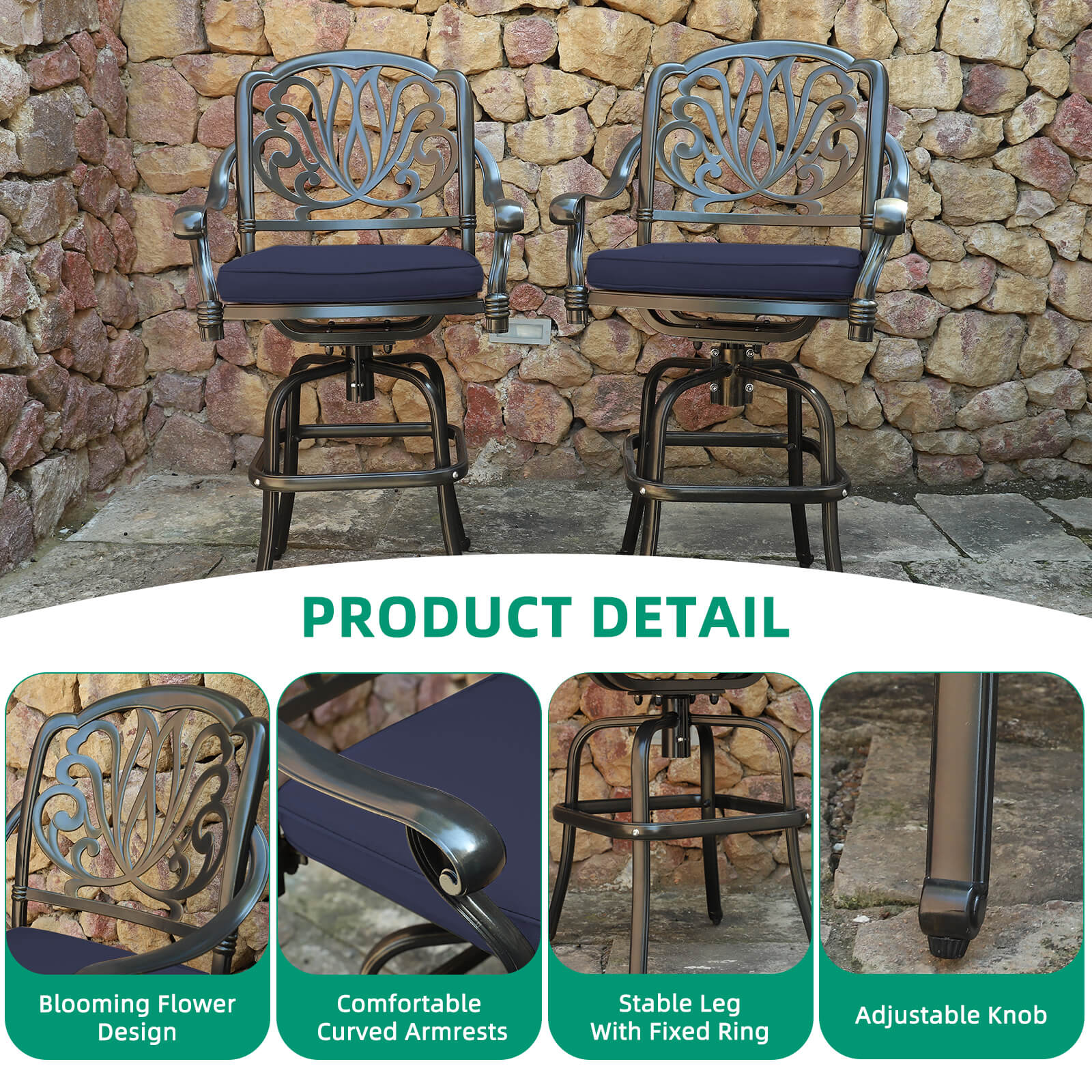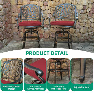 【Durable & Elegant 】Made with rust-resistant and weather-resistant cast aluminum frames, this bar dining set is covered with high-performance powder coating, which protects it from rust, scratches and harmful UV rays. The all-weather design is a more durable alternative to wrought iron patio furniture. The surfaces are meticulously hand-painted by skilled craftsmen, and the exquisite antique bronze finish with gold accents enhances its antique charm and ensures a unique appearance