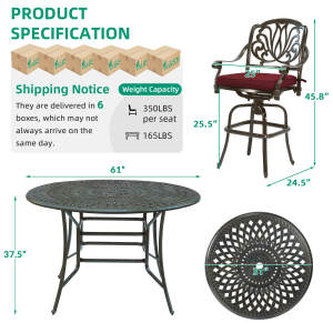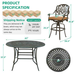 【Dimension & Easy Assembly】Table Dimensions: 37.5 in. H x 61 in. Dia.; Chair Dimensions: 24.5″(D) x 25″(W) x 45.8″(H); Cushion Dimensions: 19″(L) x 19″(W) x 2.8″(H); Table Umbrella hole: Dia 2″; Turntable diameter: 31″; Turntable Umbrella hole: Dia 2″. Quickly assemble so you can enjoy it in no time, all hardware required are included for assembly, with detailed instruction manual. Note: The desktop is divided into four pieces and packaged together for shipping