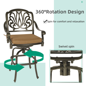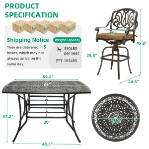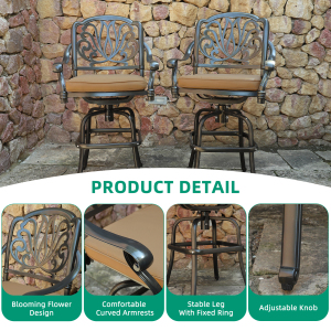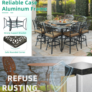 Constructed from durable cast aluminum and featuring a weather-resistant powder-coated finish, this bar dining set is designed to endure various outdoor conditions, making it a dependable choice for years of enjoyment.