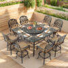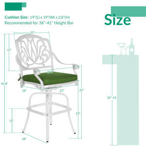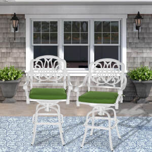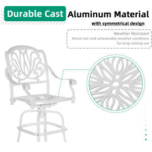 Relax and enjoy your patio and backyard while sitting on the swivel bar stools. Our bar stool is made of rust-resistant and weather-resistant cast aluminum frames with powder coating, the wide and deep patio outdoor swivel bar stools will provide enough room to seat comfortably. The unique swivel design makes it easy to sit and chat with your family or friends. Now, please enjoy a calm and soothing night or a cool sunny day on your new 2-piece swivel outdoor patio bar stools.