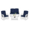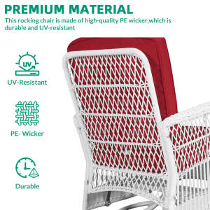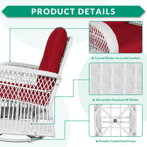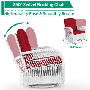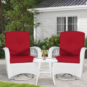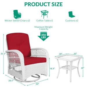 | What’s Included? | 2 White Wicker Swivel Glider Chairs, 2 Back Cushion, 2 Seat Cushion, Glass Top Side Table |