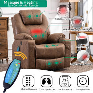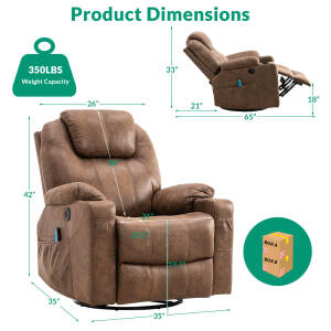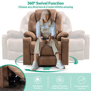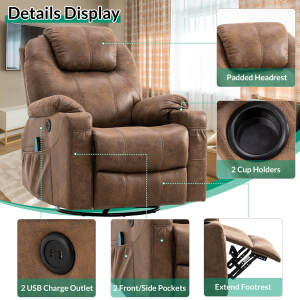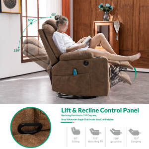 This recliner is a multipurpose model with swivel, rocking, reclining, vibrating, and heating capabilities. The recliner chair has a wide sitting base and soft composite material with supportive back and padded armrests for ultimate comfort. And the mechanism of the reclining are durable and steady, it can be operated normally for many years.