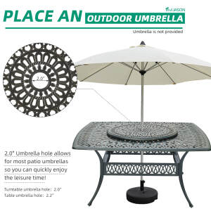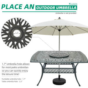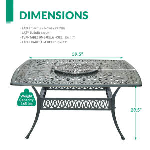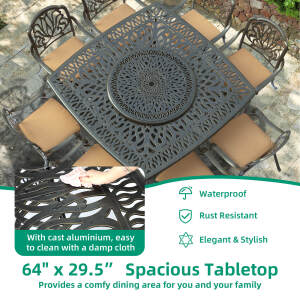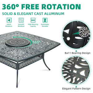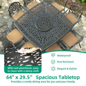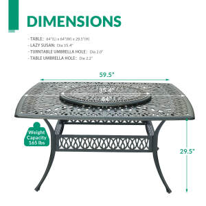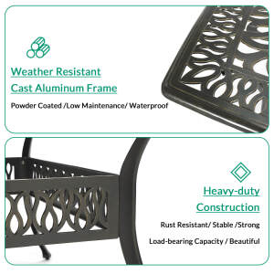 This outdoor patio dining table is made of solid cast aluminum with a rust and weather resistant powder coated finish that is durable and light-weighted for long time use