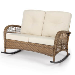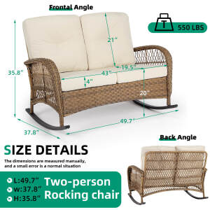【Durable, Lightweight & Reinforced】This outdoor rocking loveseat is crafted from handwoven all-weather PE wicker and a reinforced steel frame, combining sturdy strength with a lightweight design that is easy to move. It supports up to 550 pounds, offering a strong and reliable structure for two